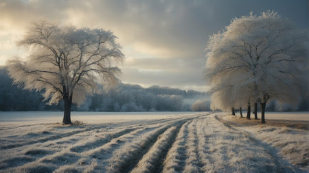 A serene winter landscape featuring a snow-covered path winding through frosty trees and fields, with a cloudy sky overhead