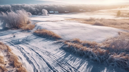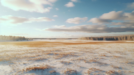 an aerial view of a winter field captured by ivus3d showcases a serene atmosphere with a light sky-blue and light amber color palette. this uhd image by ruslan lobanov portrays a pastoral scene filled with light, featuring a harmonious blend of light white and brown tones. ai generated