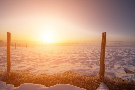 Sunrise over a field covered with hoarfrost on a cold winter morning
