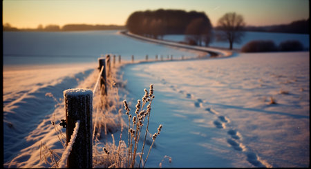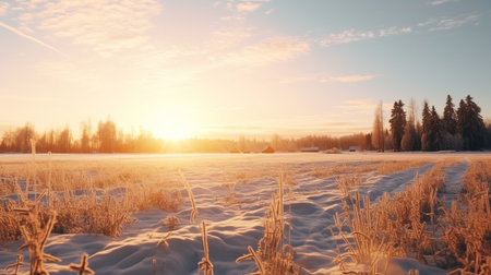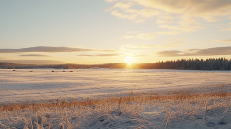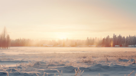 snow-covered field during sunrise on the west side of a farmland. this 32k uhd photograph captures the essence of 20th-century scandinavian style with its detailed hunting scenes. the image showcases elements of aurorapunk, outdoor scenes, and a color palette of light white and light amber. ai generated