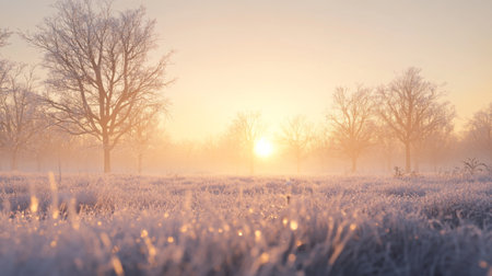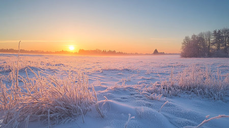 A stunning winter sunrise casts warm hues over a frosted grass field. The image captures the tranquility of nature, a perfect morning landscape to inspire serenity and peace.