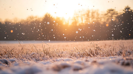 A tranquil winter scene captures snowflakes gently falling over a peaceful field at sunset.