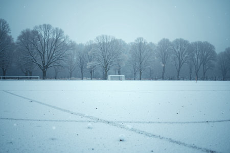 snowy soccer field with a white goalpost in the distance surrounded by leafless trees under a cloudy sky