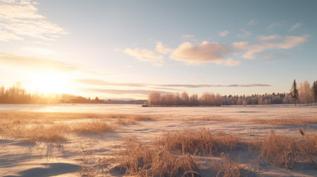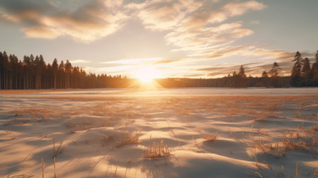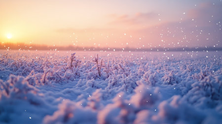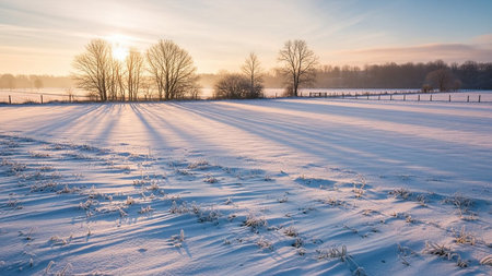A serene winter scene showcasing a stunning sunrise over a snow-covered field, highlighting the soft golden light and the tranquil beauty of nature. Perfect for winter-themed imagery.