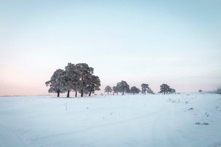Beautiful winter landscape during sunset over snow covered field