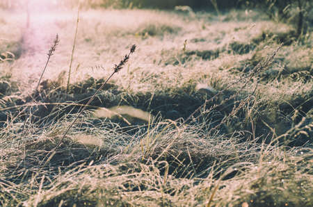 Frosted grass on a meadow at sunset. Beautiful winter landscape.