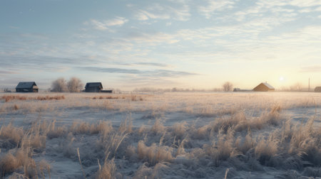 frosty landscape featuring buildings in the background, captured with a nikon d850. this photo showcases the soft color fields and gauzy atmospheric landscapes, reminiscent of prairiecore and cabincore aesthetics. the light black and sky-blue hues add to the serene depiction of rural life. ai generated