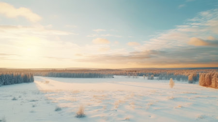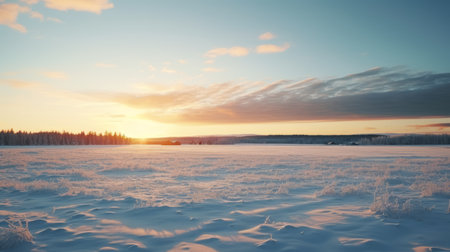 snow covered field at sunset, showcasing a serene and tranquil ambiance with its light gold and light blue hues. reminiscent of the danish golden age, this breathtaking landscape offers a spectacular backdrop, characterized by a harmonious blend of light gray and amber tones. a captivating national geographic photo capturing the essence of the helsinki school's artistic style. ai generated
