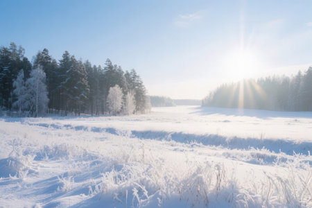 a sunny winter setting with snow-covered grass and trees, captured in 8k resolution by tyko sallinen. this serene pastoral scene showcases the essence of nature and its natural phenomena. the light aquamarine and amber tones add a touch of warmth to the winter landscape. shot on fujifilm natura 1600. ai generated