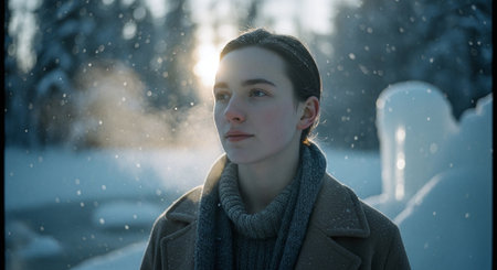 A young woman standing in a snowy landscape, wearing a warm hat and scarf, looking contemplative, surrounded by snow-covered trees