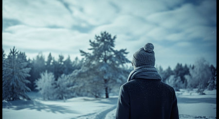 A person standing in a snowy landscape, wearing a knitted hat and scarf, looking towards a forest of snow-covered trees under a cloudy sky