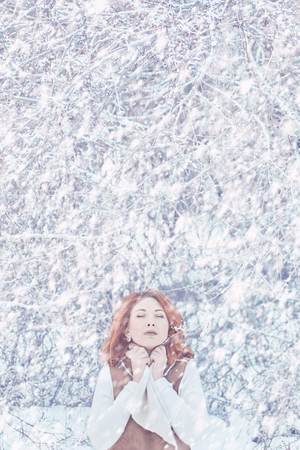 Close-up portrait of a beautiful young woman with magnificent red hair warming frozen hands in the winter forest. Middle Ages. Fairy Christmas tale.