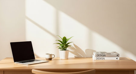 An open laptop, books, a plant, and a mug on a desk, with sunlight casting shadows.