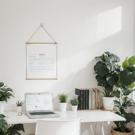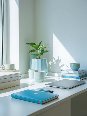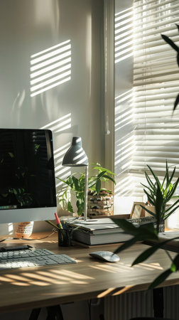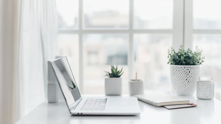 A light-filled interior scene features a laptop on a white desk alongside potted plants and a framed artwork. The composition includes a window, offering natural illumination across the minimalist space. The setting suggests a home office or creative studio suitable for various commercial or editorial applications.