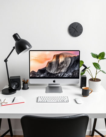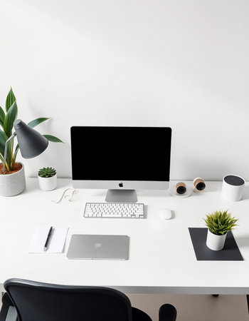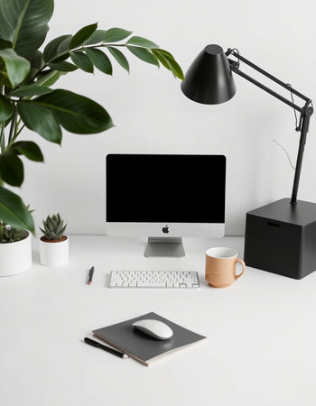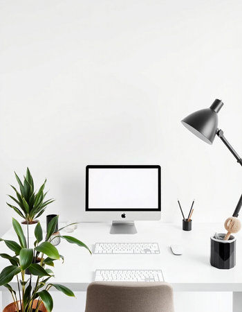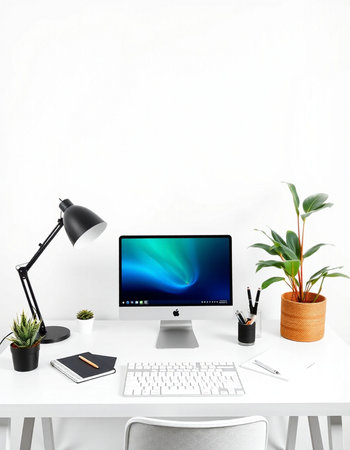 Modern workspace with computer, keyboard, mouse, lamp, and plant on white table.