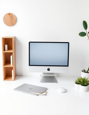 A laptop computer sits open on a bright white desk, accompanied by a keyboard, mouse, and a small potted plant. The setting is clean and minimalist, with neutral colors and soft lighting. This image could be used for various purposes, including website design, advertising, and marketing materials.