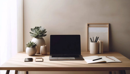 A stylish minimalist workspace featuring a laptop, notebook, and decorative plants. Perfect for creating an inspiring and productive atmosphere at home or office.