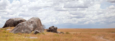 The wide gras savanna of the Serengeti with single rocks and trees, Serengeti National Park, Safari, East Africa, August 2017, Northern Tanzania