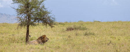 Senior male lion resting under tree Serengeti in Tanzania, East Africa