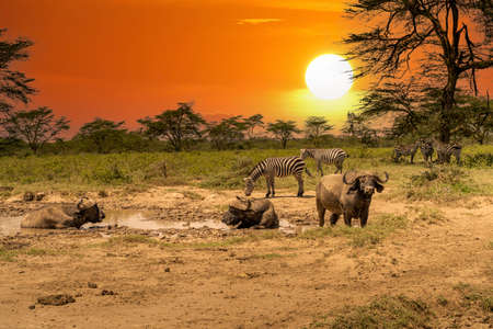 Amazing sunset at savannah plains in Tsavo East National Park, Kenya