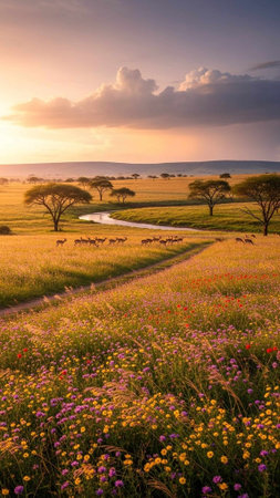 A serene savannah landscape with a vibrant wildflower meadow at sunset