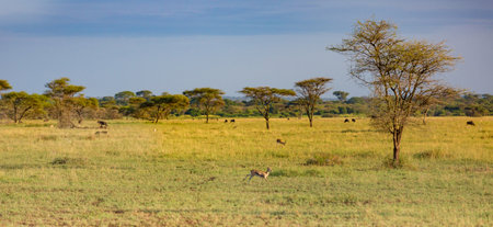 African savannah in the spring. African Acacia is evergreen on the horizon. Ecological, exotic and photo tourism concept