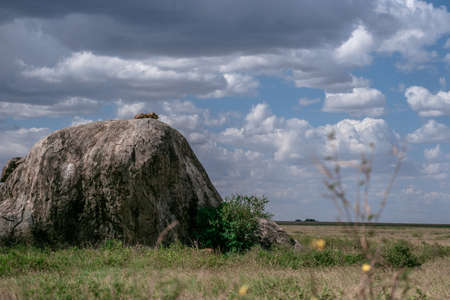 Lioness lying on the huge rock - Tanzania national park. High quality photo