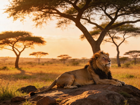 Golden sunset over vast savanna with scattered acacia trees