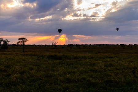 Hot air balloon over the plains of Serengeti National Park at sunrise, Tanzania