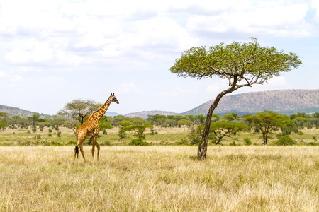 Mother and baby Maasai giraffes (Giraffa tippelskirchi) in the savanna, Serengeti National Park, Safari, East Africa, August 2017, Northern Tanzania