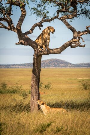 Lioness looks up at another in tree