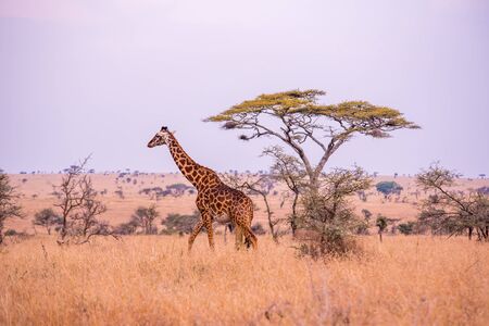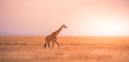 Lonely giraffe in the savannah Serengeti National Park at sunset. Wild nature of Tanzania - Africa. Safari Travel Destination.