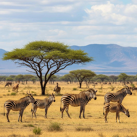 Herd of zebras and acacia tree in Serengeti National Park, Tanzania