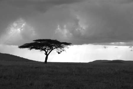Image of an acacia tree in Serengeti in black and white