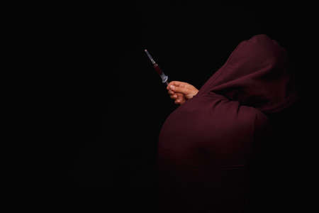 Silhouette of hooligan in hoodie holding knife isolated on black with lighting