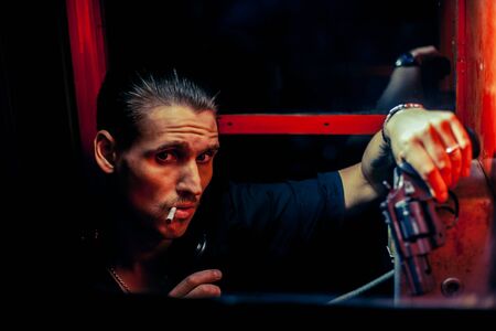 Killer or murderer concept. Mafia killer going to shot someone. Finish him. Kill them all. Final shot. Concentrate on gun shot. Need for revenge. Close up gun barrel
