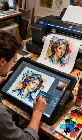 Artist working on a digital tablet at his desk in his studio.