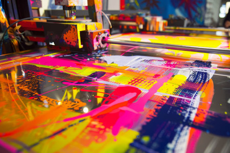 Close-up view of a machine with a vibrant and colorful design, possibly a screen printing machine, A screen printing machine with vibrant colors and bold graphics