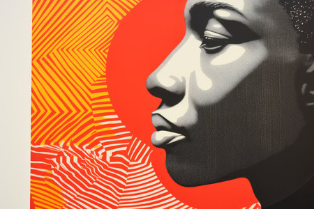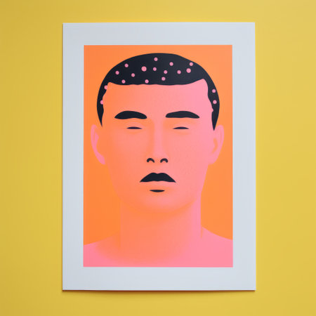 a man in pink with an orange patch on his head is depicted in this graphic design poster art. this contemporary chinese art piece showcases luminous portraits with flat figures, reminiscent of pointillist portraits. the photograph was captured using a ricoh ff-9d camera and printed in a darkroom. ai generated