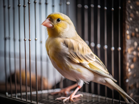 selective focus. Curious yellow canary looks straight sitting on a cage on a light background.