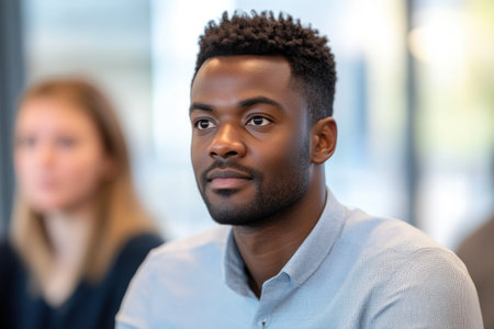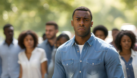 Sad african american man standing in front of group of people