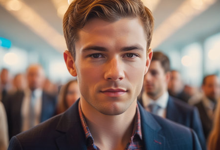 Handsome young businessman with a confident look in a crowd. Represents leadership and professionalism.