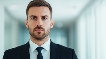 Professional man in formal attire looking confidently at the camera in a modern office space with blurred background emphasizing focus and determination