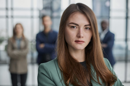 Business leader stands confidently in front of a diverse team in a contemporary office, highlighting collaboration and professionalism in a dynamic workspace