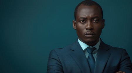 A man in a suit stands with arms crossed against a teal backdrop.