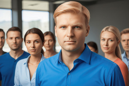 A group of professionals stand together, led by a confident male leader in a modern office setting, exuding a sense of unity and determination.