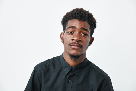 Young african man with dark skin and short curly hair wearing black shirt looking at camera with neutral expression on white background.