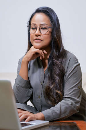 Pensive middle-aged businesswoman in glasses reading important document on laptop screen
