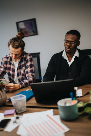 Two entrepreneurs men sitting at desk in office and brainstorming together.