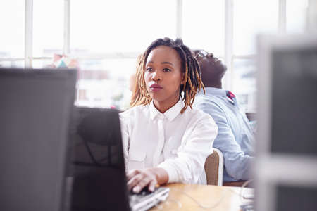Mixed race female creative worker sitting at desk using computer. modern office of a creative design business.